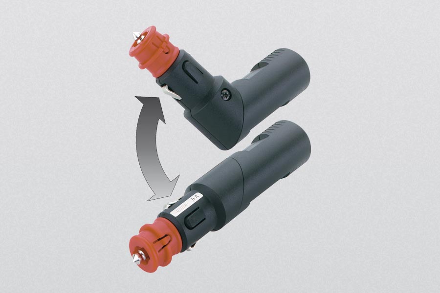180º stufenlos schwenkbar, mit und ohne Zugentlastung, mit Schraubkontakten, festarretierbarer Ausgleichshülse durch Bajonettverrastung. Mit integrierter, auswechselbarer Sicherung von 1 bis 8 A / 12-24 V, passend für Zigarettenanzünder- und Normsteckdosen.